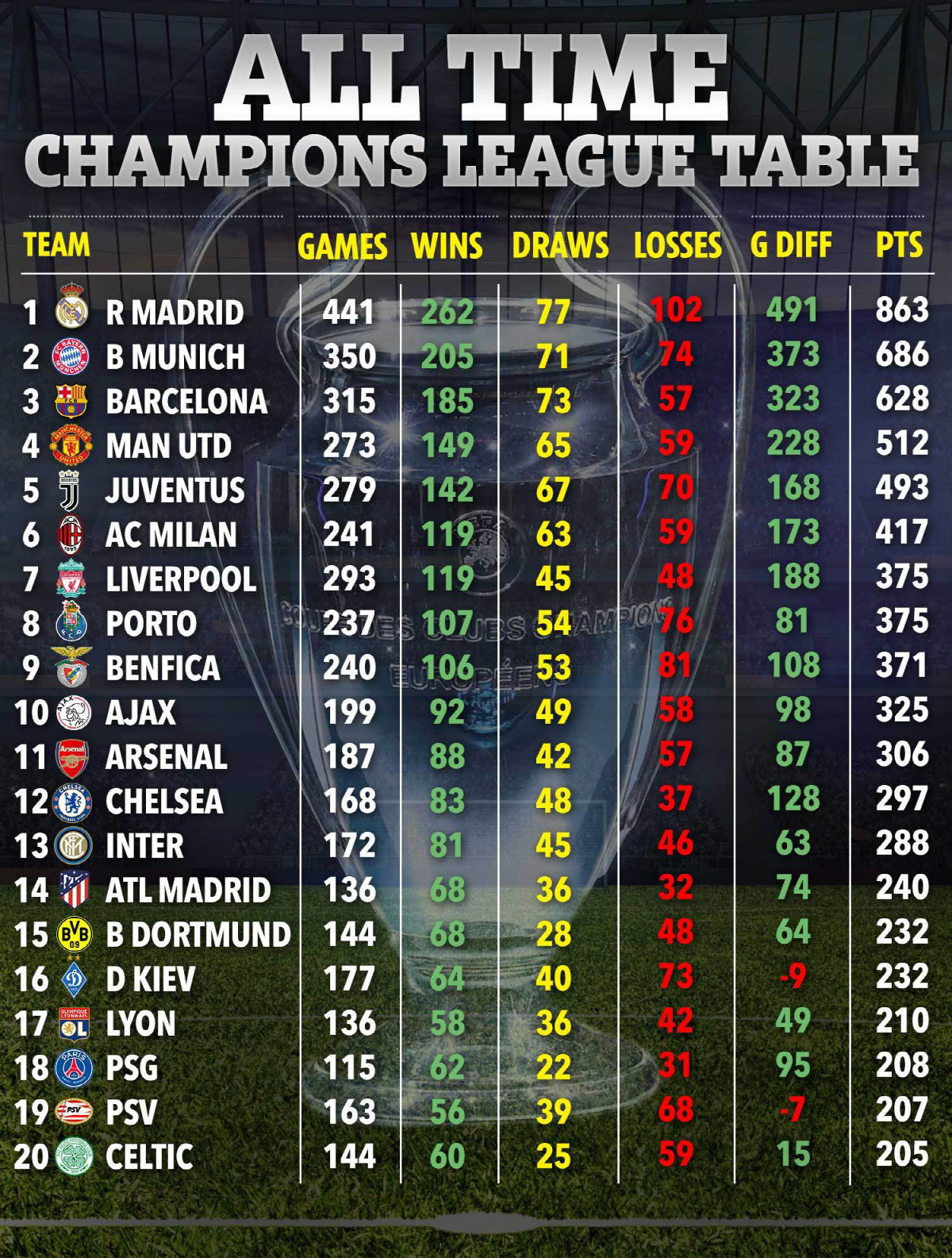 그 뒤를 맨유(승점 512), 유벤투스(승점 493), AC밀란(승점 417), 리버풀(승점 375·골득실 +188), 포르투(승점 375·골득실 +81), 벤피카(승점 371), 아약스(승점 325) 등이 이었다. 명문팀들이 모조리 이름을 올린 가운데, 16위에 우크라이나의 디나모 키예프가 오른 것이 눈에 띄었다.
