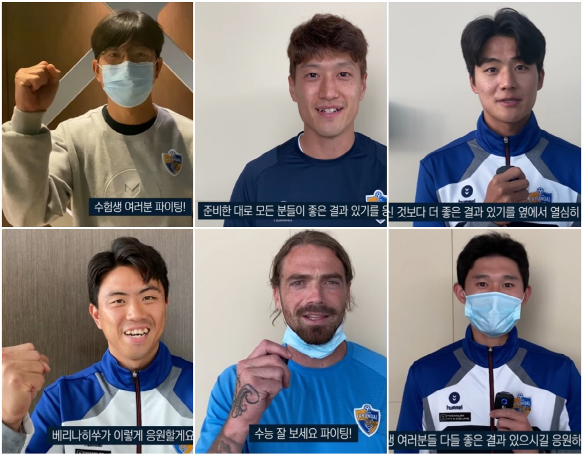 울산 유스 출신 1998년생 영건 설영우 역시 3~4세 어린 동생 수험생들에게 따뜻한 마음을 전했다. "수험생 여러분, 수능 준비하느라 고생 많이 하셨고요. 준비하신 것보다 더 좋은 결과 있기를 옆에서 열심히 응원하겠습니다." '블루 드래곤' 이청용은 "수험생 여러분들, 어려운 시기에 수능 준비하시느라 어느 때보다 고생 많으셨을 텐데 준비한 대로 모든 분들이 좋은 결과 있기를 응원하겠습니다"라며 환한 미소를 지어보였다.
