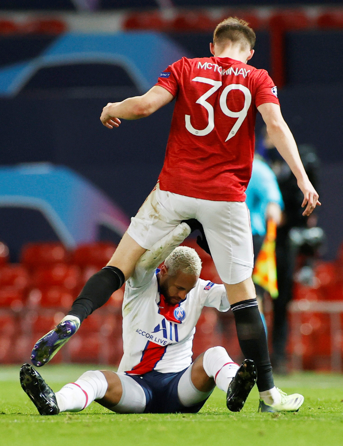 맥토미니는 과감한 태클로 네이마르의 드리블을 차단했다. 네이마르는 중심을 잃고 잔디 위에 쓰러졌다가 앉아있었다. 그때 뒷걸음치던 맥토미니가 네이마르의 오른 발목을 밟았다. 이때 네이마르의 양 손이 맥토미니의 중요 부위에 닿았다. 네이마르는 맥토미니가 고의로 자신의 발목을 밟았다고 생각해 맥토미니와 주심에게 강하게 항의했다. 솔샤르 감독은 네이마르의 행동에 고의성이 있다고 판단한 것으로 보인다. 주심은 이 건에 대해 어떠한 조치도 취하지 않았다.