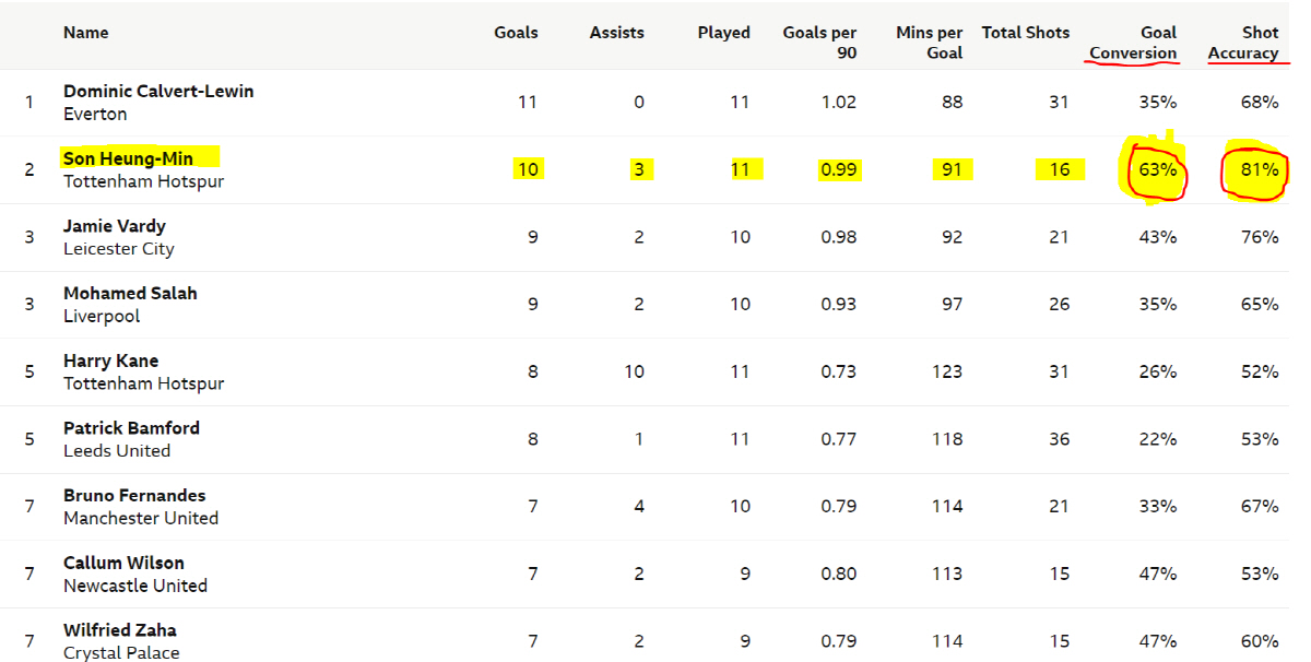 득점 선두 칼버트 르윈은 11경기서 총 31번의 슈팅을 날렸다. 손흥민 보다 한골 많지만 골 전환율(35%)과 슈팅 정확도(68%)는 큰 차이를 보인다.