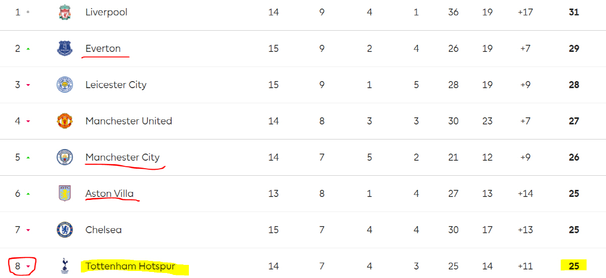밤 사이 에버턴이 셰필드 유나이티드 원정에서 시구르드손의 결승골로 1대0 승리하면서 승점 29점으로 2위로 도약했다. 바디를 앞세운 레스터시티는 맨유와 난타전 끝에 2대2로 비기면서 승점 28점으로 3위. 맨유는 승점 27점으로 4위다. 맨체스터시티도 홈에서 뉴캐슬을 2대0으로 잡으면서 승점 26점으로 5위로 뛰어올랐다. 수적 열세에도 애스턴빌라는 크리스탈팰리스를 3대0으로 대파하면서 6위로 약진했다. 아스널 원정에서 1대3으로 완패한 첼시는 승점 25점으로 7위. 경기가 없었던 토트넘은 8위까지 밀려왔다. 토트넘은 29일 새벽 4시15분(한국시각) 울버햄턴과 리그 원정 경기를 갖는다. 토트넘은 최근 리그 3경기서 1무2패로 부진했다. 그 결과, 이렇게 한참 밀려내려왔다. 따라서 이번 울버햄턴 원정이 매우 중요하다. 토트넘은 지난 2019~2020시즌 리그 6위로 마쳤다.