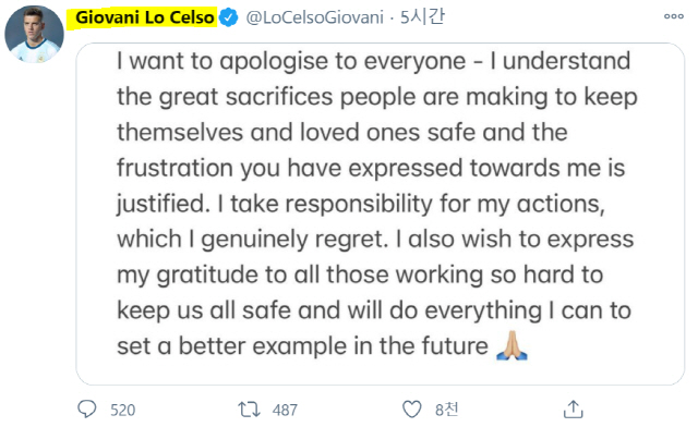 코로나19 방역 지침을 어기고 크리스마스 파티를 즐긴 토트넘 미드필더 로셀소(아르헨티나 출신)가 자신의 SNS를 통해 사과의 뜻을 전했다.