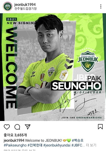 [스포츠조선 노주환 기자]전북 현대가 백승호(24) 입단 소식을 구단 SNS를 통해 공식적으로 알렸다.