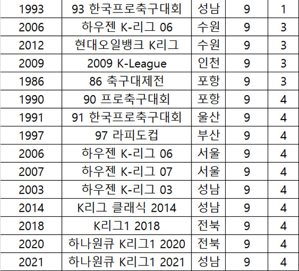 김남일 감독 체제로 출범한 지난시즌 초반 9경기에서 8골을 헌납한 성남은 올해 9경기에서 그 절반인 4골만을 내주고 있다. 9라운드 현재 12개팀 중 최소실점이다. 경기당 평균 0.44실점으로, 2경기를 치르면 1골도 허용하지 않은 셈이다. 이는 2013년 스플릿 라운드 출범 이후 9라운드 기준 최소실점 타이 기록이기도 하다. 지금껏 2팀만이 4실점 선방했다. 2018년과 2020년 우승팀인 전북 현대, 그리고 2014년 성남이다. 프로축구 통산 9라운드 기준 역대 최소실점 기록을 보유한 팀도 성남이다. 1993년 당시 전신인 성남 일화 이름을 달고 9경기에서 단 1골을 내주는 '질식수비'를 펼쳤다. 성남은 1993년 우승을 시작으로 내리 3연패했다.