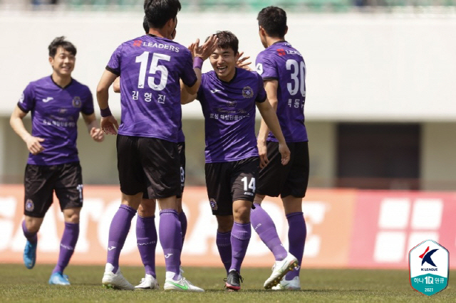 그라운드 위에서 부딪치고 쓰러지며 앞으로 나아가는 홍창범. 그는 18일 홈에서 열린 충남아산과의 7라운드 대결에서 프로 데뷔골을 터뜨렸다. 경기가 0-0이던 전반 14분 맹성웅의 도움을 받아 충남아산의 골망을 흔들었다. 팀은 2대1 승리를 거두며 3경기 무패행진을 기록했다.