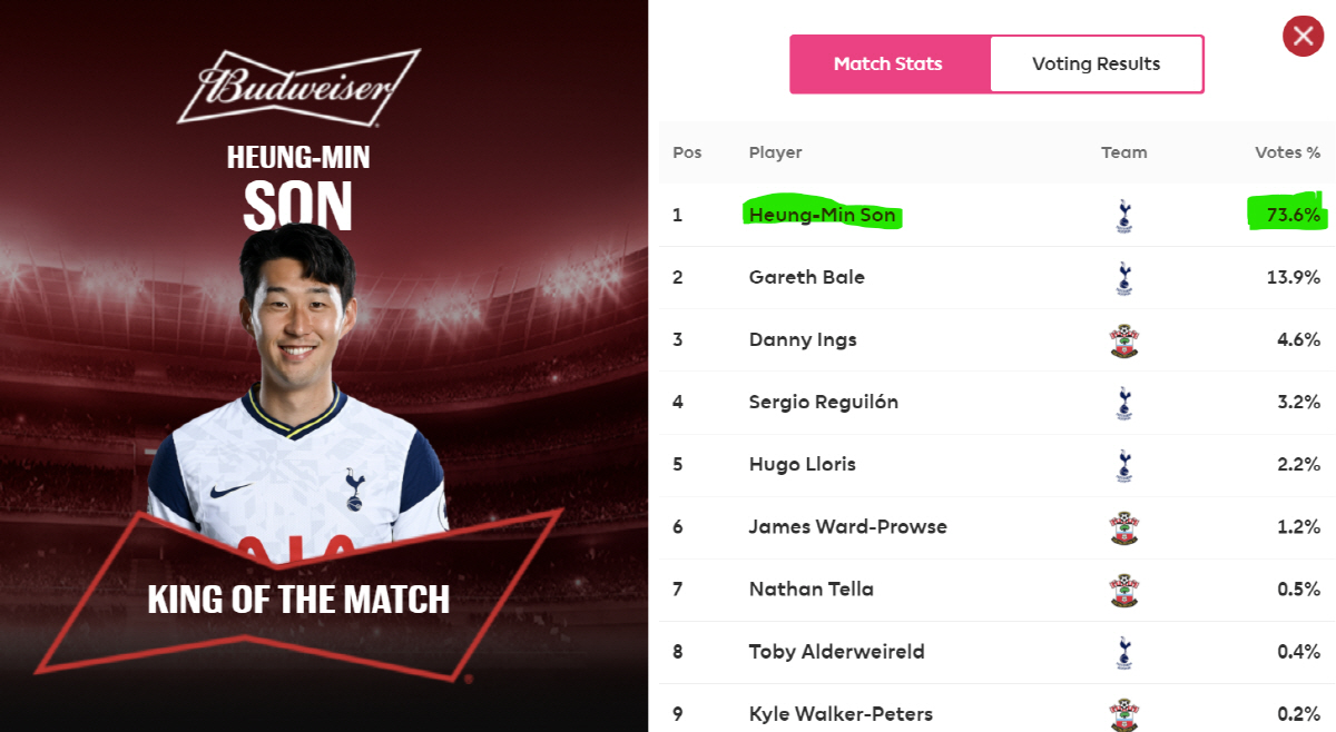 EPL 홈페이지가 22일 공개한 토트넘-사우스햄턴전 '킹 오브 더 매치' 투표 결과, 역전 결승 PK골을 넣은 손흥민이 가장 높은 73.6%의 지지를 받았다. 그 다음은 동점골을 터트린 가레스 베일(토트넘)로 13.9% 지지를 받았다. 3위는 선제골 주인공 대니 잉스(사우스햄턴)으로 4.6%였다.