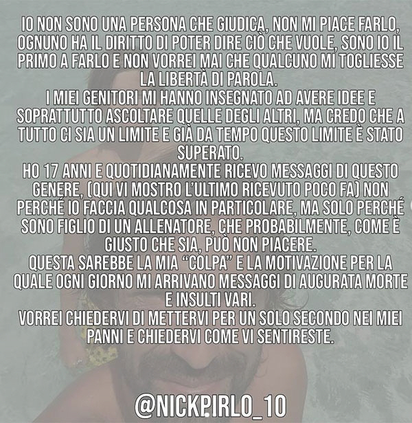 부친과 같은 축구선수를 꿈꾸는 니콜로는 "내가 특별히 무얼 해서 이런 메시지를 받은 게 아니다. 단지 내 아빠가 감독이어서 그런거다. 코치의 아들이란 사실이 내 '잘못'인가 보다. 그래서 그들은 나의 죽음을 기원하는 메시지와 다양한 욕설이 담긴 메시지를 매일같이 보내는 것이다. 나는 잠시만이라도 내 입장이 되어보고 어떻게 느낄지 자문해 보길 권한다"고 말했다.