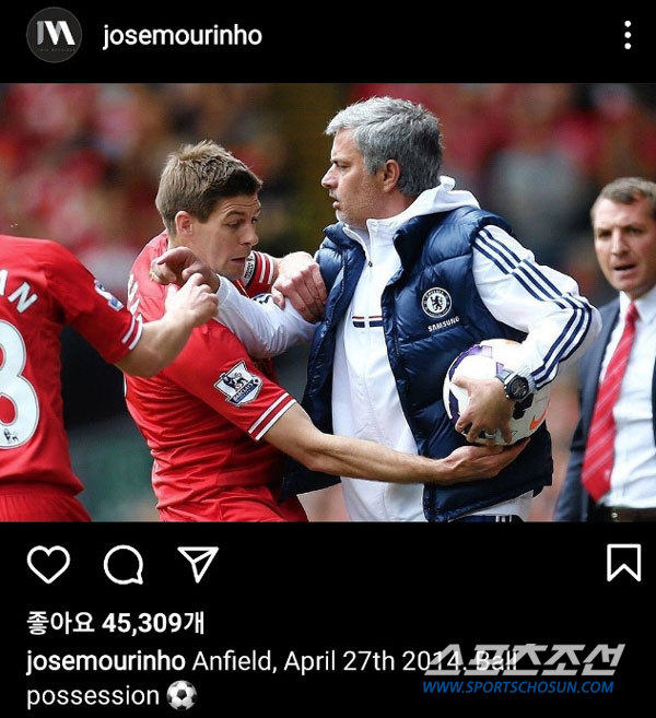 무리뉴 감독은 27일 개인 SNS에 과거 경기 사진 하나를 올렸다. 첼시 사령탑 시절이던 2014년 4월 27일, 그러니까 7년 전 오늘 사진이다. 리버풀과 맞대결에서 당시 리버풀 주장 스티븐 제라드와 공을 다투고 있다. 무리뉴 감독이 옆구리에 낀 공을 제라드가 필사적으로 뺏는 모습이다. 뒤에 브랜든 로저스 당시 리버풀(현 레스터) 감독의 모습이 보인다. 무리뉴 감독은 "볼 포제션"이라는 짤막한 문구만 삽입했다.