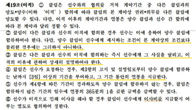 또 기존에는 구단이 선수 의사에 관계 없이 이적, 트레이드를 진행했으나, 표준계약서에선 '선수와의 협의'를 거치도록 했다. 또 특별한 사유가 없는 한 선수에게 더 불리한 조건으로 트레이드가 이뤄질 수 없도록 했다. 계약 이후에는 선수에게 사유를 상세히 설명하도록 하고, 선수가 요청하는 경우 3일 이상의 준비 기간을 부여하도록 했다.