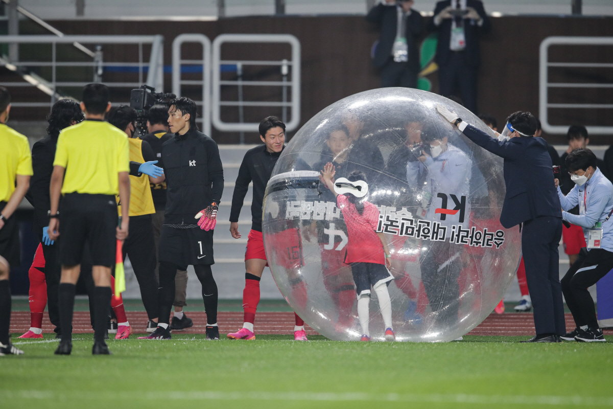 에스코트 키즈는 'KT 버블 에스코트'로 대신했다. 보통의 축구 경기 때는 어린이들이 태극전사들과 함께 입장했다. 이들을 '플레이어 에스코트'라고 불렀다. 코로나19로 태극전사 옆에는 그 누구도 설 수 없다. 그래서 KFA와 KT가 대안을 찾았다. 바로 '버블 에스코트'였다. 대형 고무 버블(풍선) 안에 아이들이 들어갔다. 선수들과 직접적인 터치를 방지하는 대신 간접 하이파이브를 할 수 있도록 고안했다.