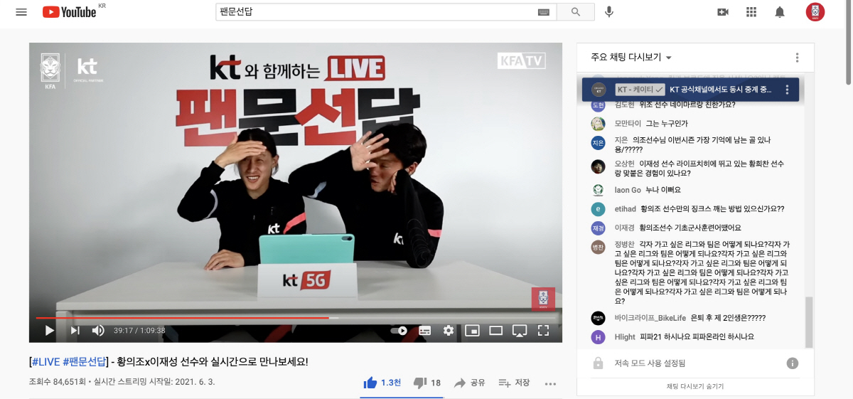 또 태극전사들은 이번 소집 기간 동안 랜선을 통해 팬들과 직접 만나고 있다. 'KT와 함께 하는 팬문선답(팬들이 묻고 선수가 답한다)' 코너다. 유튜브를 통해 라이브로 진행되고 있다. 황의조(보르도)-이재성(홀슈타인 킬) 등이 이 코너에서 한 골 세리머니 약속을 투르크메니스탄전(5대0) 전반 10분 결승골을 터트린 후 펼쳐보이기도 했다.