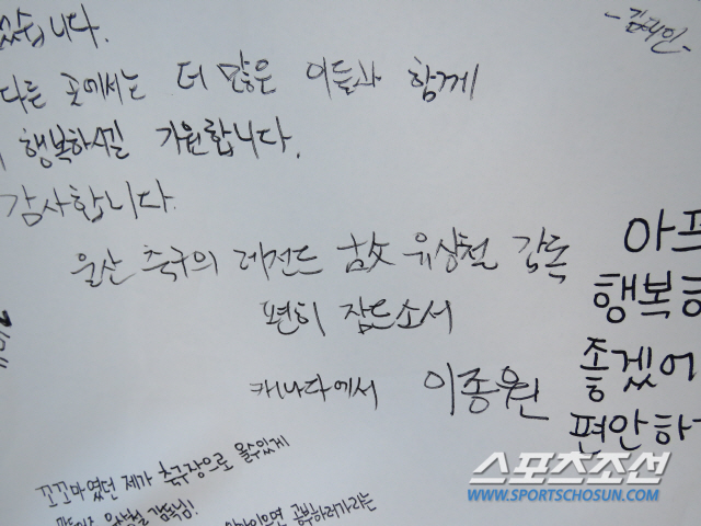 유 감독의 영정 사진 앞, 조화 사이로 일본 J리그 시절 오랜 팬들의 메시지도 눈에 띄었다. 추모공간 한켠에 마련된 백지 위에 팬들은 저마다 마음에 담아놓은 고 유상철 감독과의 추억을 풀어놓으며 무한한 감사와 고인의 평안을 기원했다.