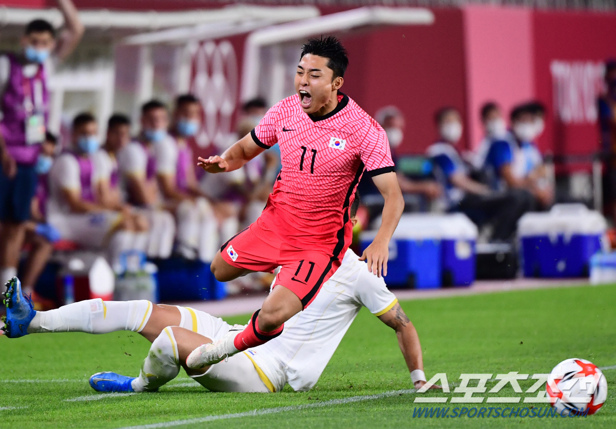 2020 도쿄올림픽 남자축구 조별리그 B조 2차전 대한민국과 루마니아의 경기가 25일 이바라키현 가시마 스타디움에서 열렸다. 한국 이동준이 루마니아 기타와 볼을 다투고 있다. 가시마=최문영 기자 deer@sportschosun.com /2021.07.25/