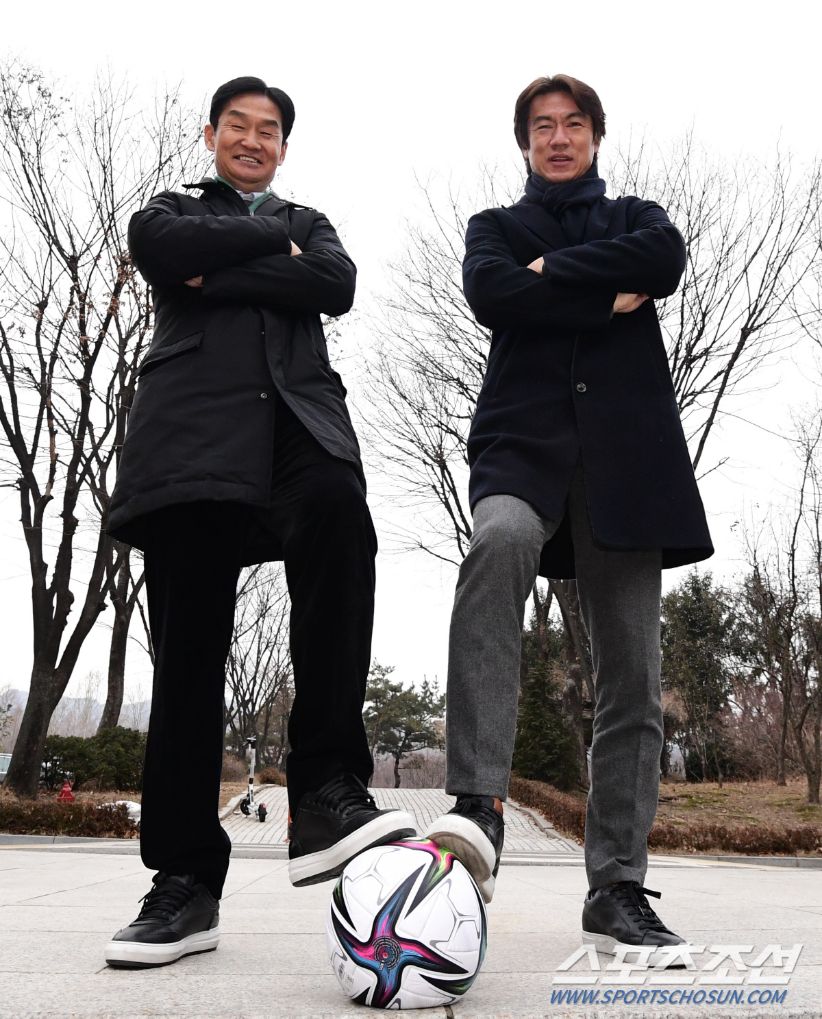 2002년 한-일월드컵 4강 신화의 주역인 홍 감독과 최 감독은 절친한 선후배 사이다. 하지만 그라운드에는 아군 아니면 적군 뿐이다. 두 사령탑은 돌고, 돌아 올해 처음으로 K리그에서 '적'으로 맞닥뜨린다. 무대에 오르기 전 홍 감독과 최 감독을 한 자리에서 만났다. K리그라는 공통분모에서 가진 첫 단독 '듀오인터뷰'다.