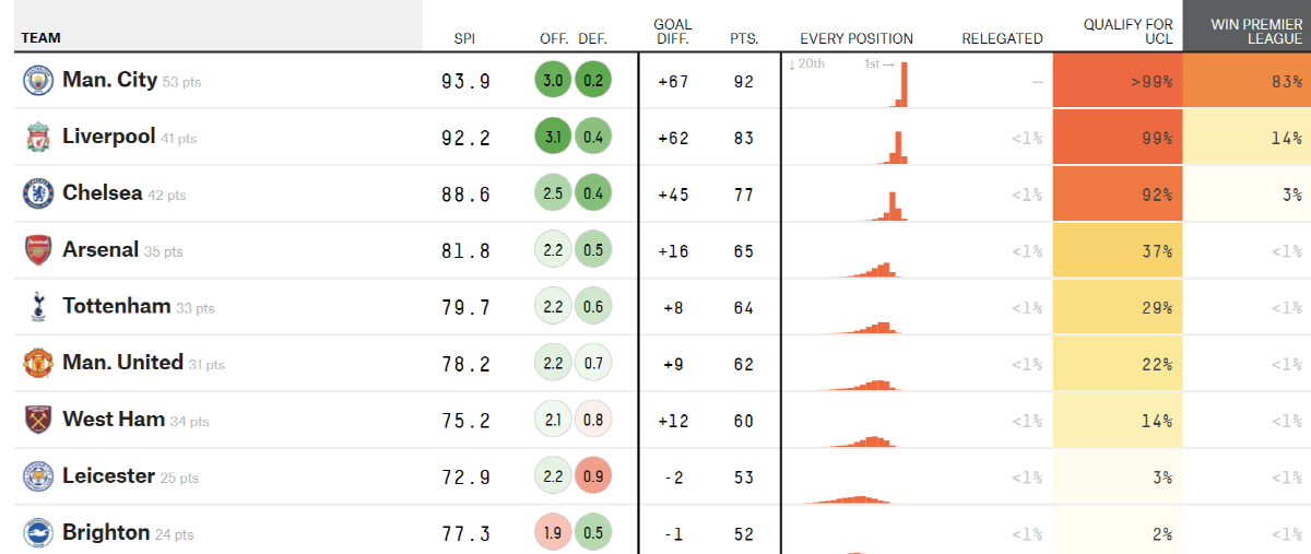 '파이브서티에이트'에서 맨시티에 이어 우승 확률 2위는 리버풀로 14%이며, 첼시는 3%다. 그 나머지 아스널 토트넘 맨유 등은 우승 확률이 0%로 전망됐다.