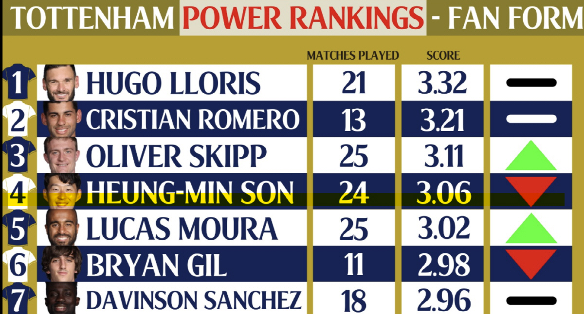 [스포츠조선 노주환 기자]한국 축구 최고 스타 손흥민(30·토트넘)이 토트넘 팬들이 매기는 '선수 파워랭킹'에서 순위가 떨어지고 있다.
