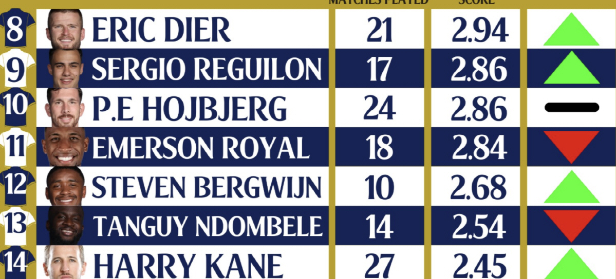 최근 '산책' 교체로 팬들의 비난을 받은 미드필더 은돔벨레는 13위, 조금씩 경기력을 되찾고 있는 간판 스타 공격수 케인은 14위, '재능 천재' 알리는 23위에 랭크됐다.