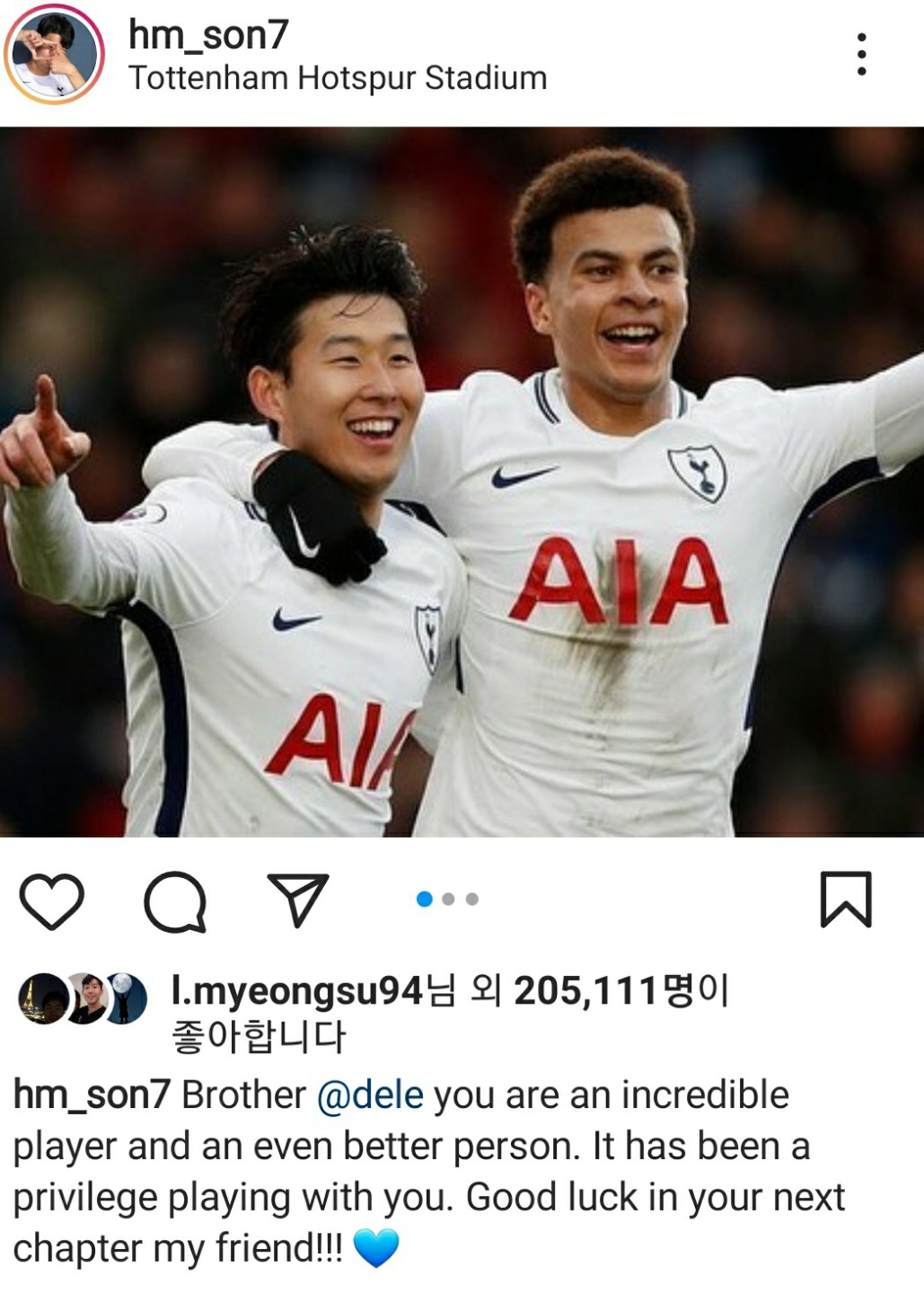 손흥민은 자신의 SNS를 통해 '내 형제 델리, 너는 환상적인 선수이고 그보다 더욱 좋은 사람'이라며 칭찬했다. 이어 '너와 함께 뛰었던 것은 엄청난 특권이었다. 내 친구의 인새엥 있어 다음 챕터에서도 행운이 있기를 빈다'고 덧붙였다.