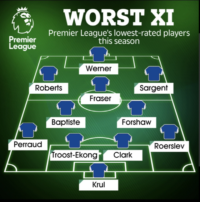 3일(한국시각) 기브미스포츠는 통계 전문 사이트 후스코어드닷컴의 평점을 기준으로, 각 포지션별 지금까지 가장 낮은 평점을 받은 선수로 베스트11을 꾸렸다. 4-5-1 포메이션으로 골라본 이 라인업은 보기만 해도 답답한 선수들로 가득하다.