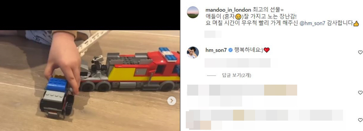 '박지성 아내' 김민지 아나운서는 8일(한국시각) 자신의 SNS에 "최고의 선물=애들이 (혼자)잘 가지고 노는 장난감! 요 며칠 시간이 무우척 빨리 가게 해주신 손흥민 감사합니다"라는 글과 함께 아이들의 놀이 영상을 찍어 올렸다.