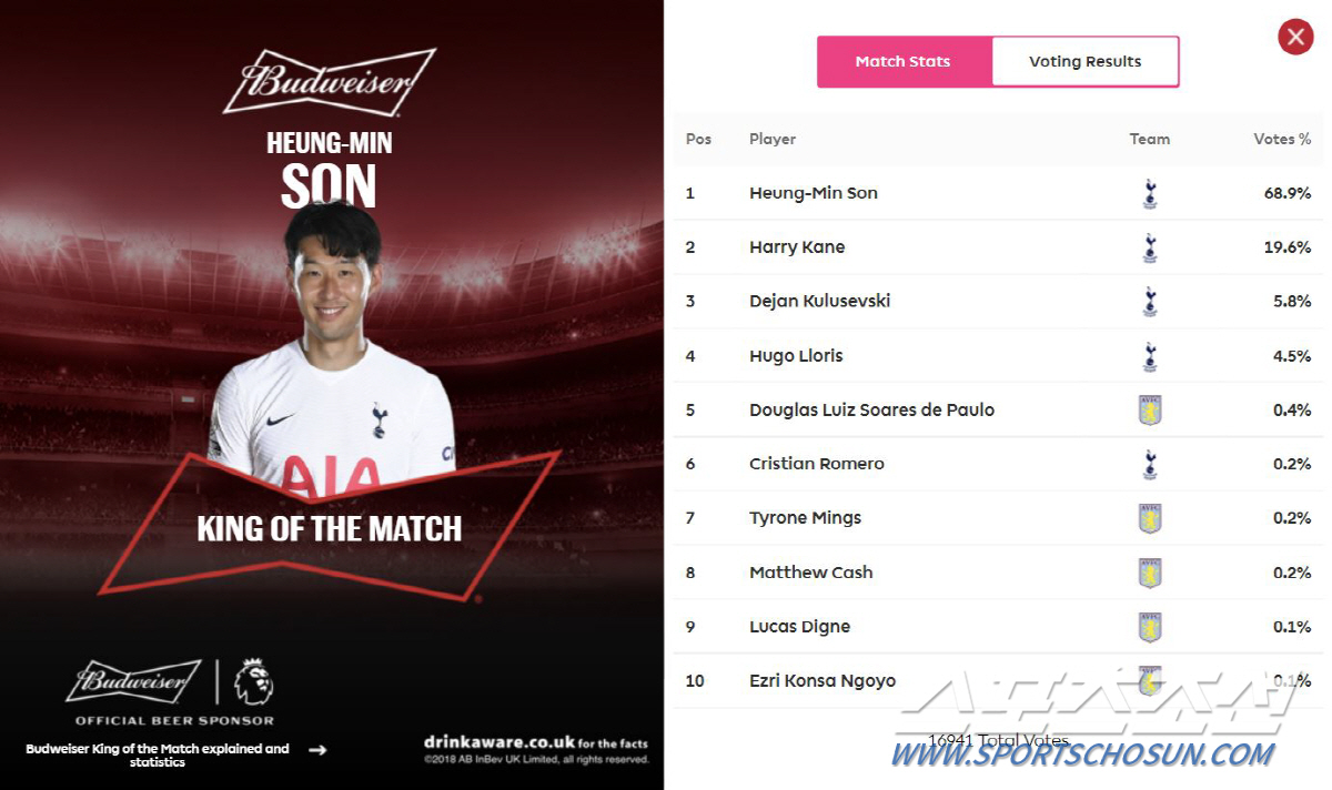 [스포츠조선 이원만 기자] 토트넘 홋스퍼 손흥민이 벌써 11번째 '경기의 왕'으로 뽑혔다. 이제 1번만 더 뽑히면 리그 최다 타이를 이룬다. 명실상부 'EPL 최고기량'에 등극하게 된다.