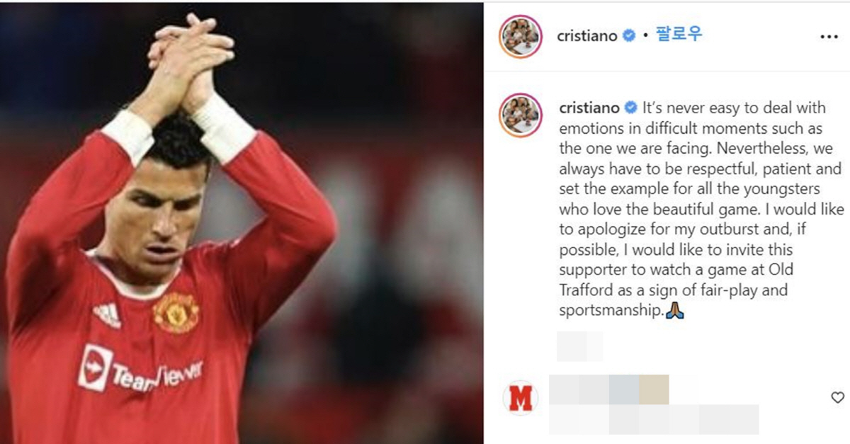 그리고 호날두가 자신의 SNS를 통해 직접 사과문을 올렸다. '우리가 직면한 상황에서 감정을 조절하기란 결코 쉽지 않다. 그럼에도 불구하고 우리는 이 아름다운 게임을 사랑하는 모든 어린 친구들을 위해 존중하고 인내하고 좋은 본보기가 돼주어야 한다. 내 분노 폭발에 대해 사과드린다. 그리고 만약 가능하다면 페어플레이와 스포츠맨십의 증거로 이 서포터를 올드트라포드에 초청해 경기를 보게 해드리고 싶다.'
