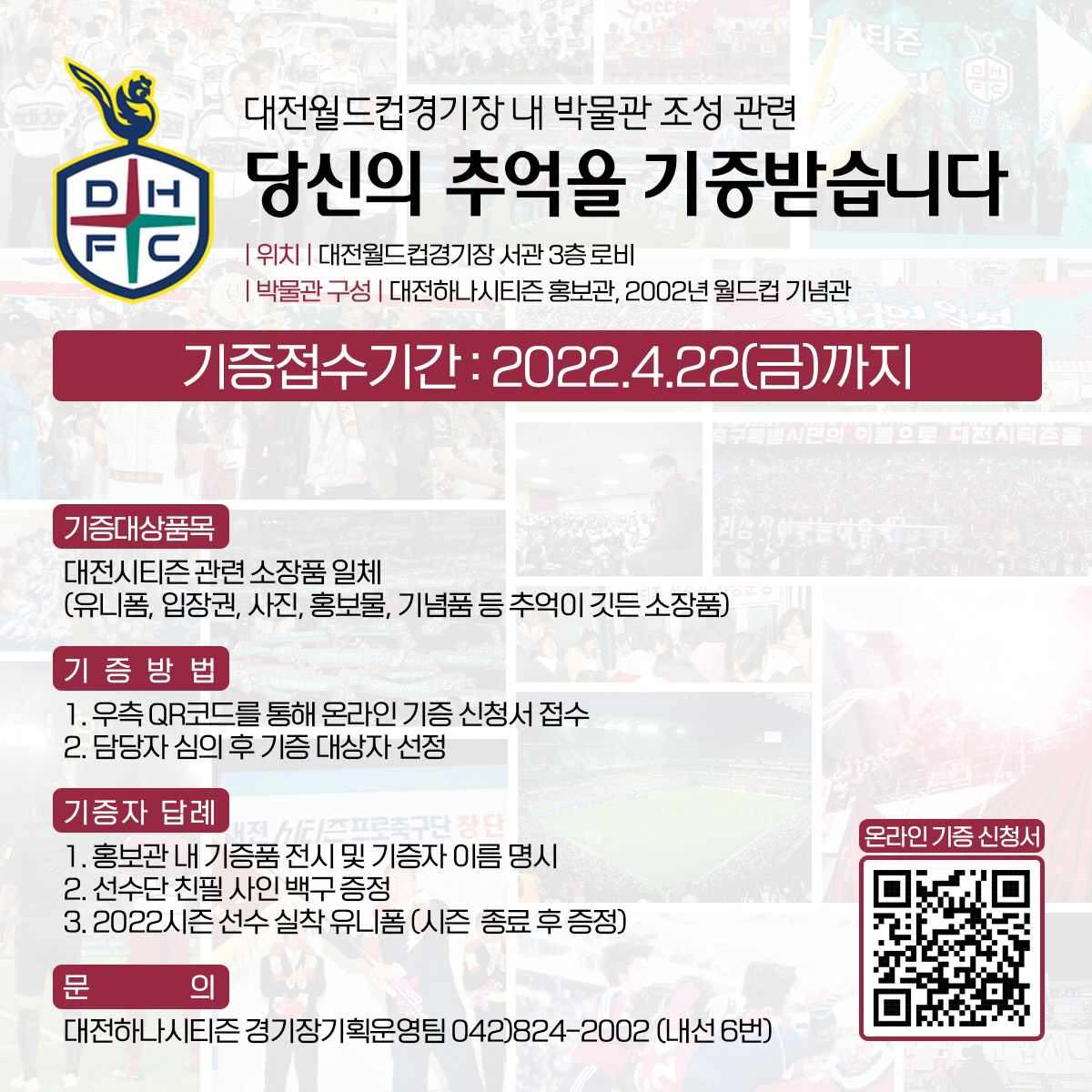 [스포츠조선 박찬준 기자]대전하나시티즌이 대전월드컵경기장 내 박물관 조성을 위해 팬들의 소장품을 기증받는다.