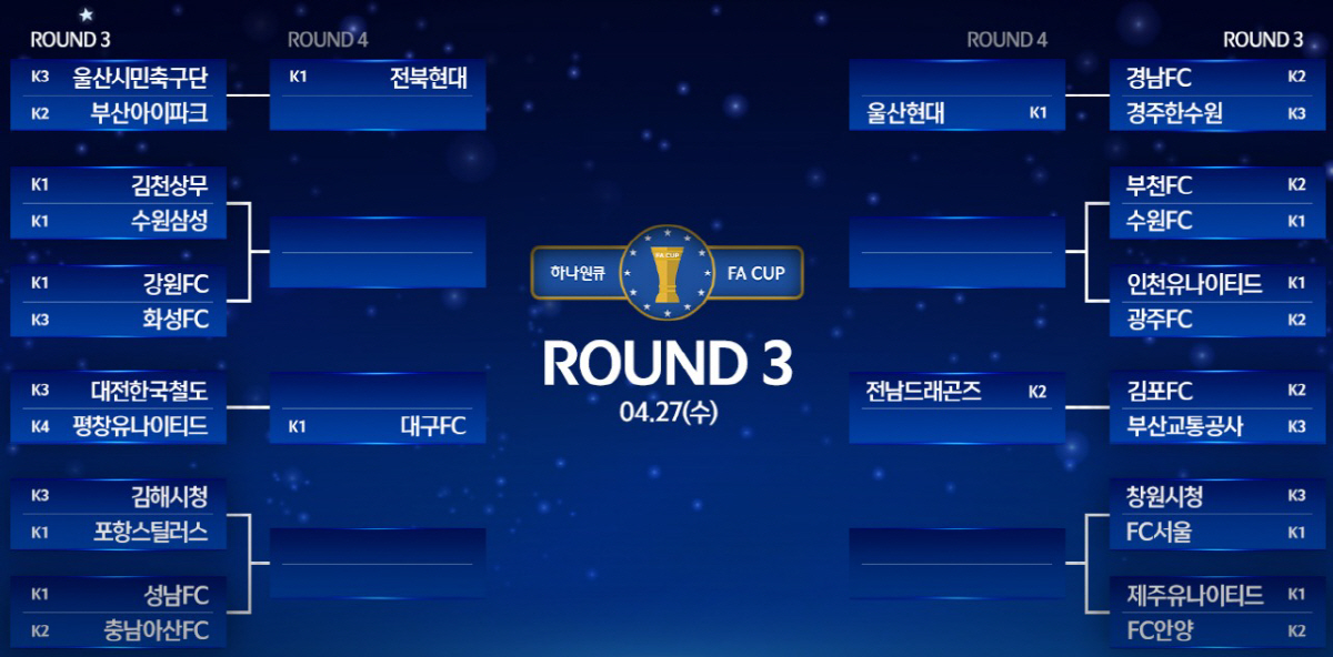 ACL에 출전하고 있는 전북, 울산, 대구와 2부의 전남은 4라운드인 16강전부터 FA컵에 함께한다. K리그1에 '실전의 계절'이 다시 돌아왔다. FA컵 우승팀에는 다음 시즌 ACL 출전 티켓이 돌아간다.
