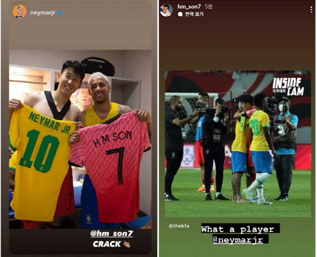 경기 후에도 화제는 이어졌다. 네이마르는 자신의 SNS를 통해 손흥민과 라커룸에서 유니폼을 교환하구 함께 찍은 인증샷을 공개했다. '손흥민(@hm son7) 크랙(CRACK)'이라는 찬사와 함께 박수를 치는 이모지를 덧붙였다. 크랙은 스페인, 포르투갈어에서 초일류 축구선수, 에이스를 뜻하는 단어다. 축구에서 경기 흐름을 바꾸는 뛰어난 역량을 가진 천재적 선수를 뜻하는 찬사다.