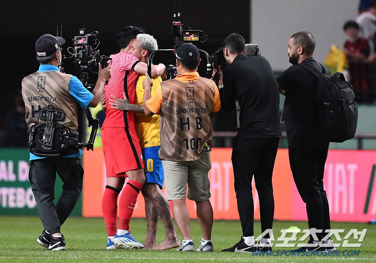 손흥민의 존재감은 엄청났다. 경기 뒤 브라질 선수들이 손흥민과 인사하기 위해 '대기 줄'을 만들어야 했을 정도다. 네이마르는 물론이고 전설적인 선수들이 줄줄이 대기했다. 손흥민은 다니엘 알베스와 인사를 마친 뒤 한국 선수들을 챙겼다. 브라질 선수들은 손흥민에게 다가가 인사를 건넸다. '수비라인' 알렉스 산드로, 마르퀴뇨스, 티아고 실바가 줄줄이 서서 손흥민과 인사를 나눴다. 이 모습은 중계 방송, 팬들의 '직캠' 등을 통해 퍼져나갔다. 팬들은 '이것이 바로 손흥민의 위엄'이라며 놀라워했다.
