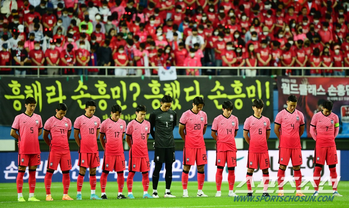 대한민국과 칠레의 축구 A매치 친선경기가 6일 대전월드컵경기장에서 열렸다. 경기전, 선수들이 순국 선열에 대한 묵념을 하고 있다. 대전=최문영 기자 deer@sportschosun.com/2022.06.06/