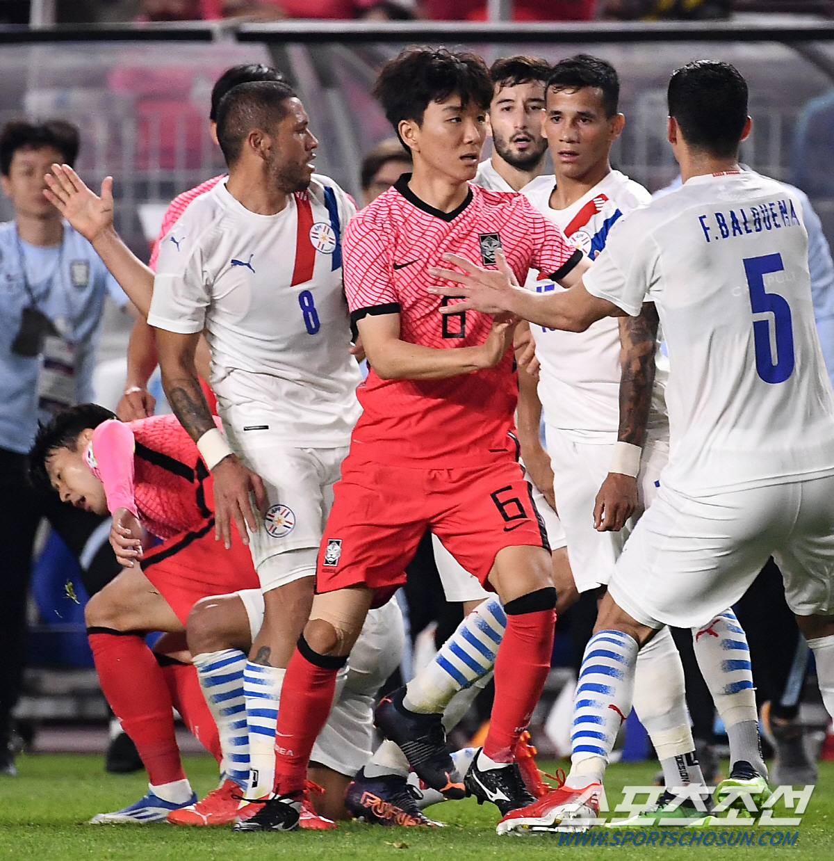 이때 파라과이 선수들의 불필요한 행동이 나오며 순간 경기장 분위기는 과열됐다. 후반 추가시간 49분 종료를 앞둔 시점에서 손흥민에게 볼이 없던 상황 파라과이 루세나가 손흥민을 거칠게 잡아당기며 넘어뜨렸다. 비신사적인 행동이었다.