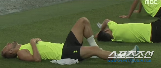 '너무 힘들어' 휴식 취하는 토트넘 선수들<저작권자(c) 연합뉴스, 무단 전재-재배포 금지>