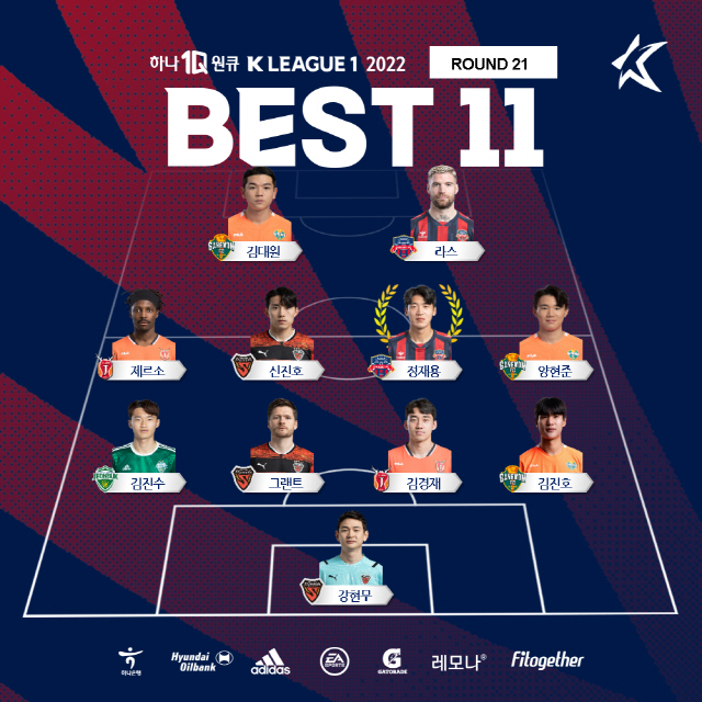 21라운드 베스트11은 최전방에 김대원(강원), 라스(수원FC)가. 미드필드에 제르소(제주), 신진호(포항) 정재용 양현준(강원)이, 수비진에 김진수(전북), 그랜트(포항), 김경재(제주) 김진호(강원)가, 골키퍼는 강현무(포항)가 이름을 올렸다.