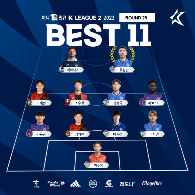한편, K리그2 26라운드 MVP는 충남아산FC 유강현이 차지했다. 유강현은 10일 이순신종합운동장에서 열린 전남 드래곤즈와의 경기에서 멀티 골을 기록하며 팀의 4대0 승리에 기여했다. K리그2 26라운드 베스트11은 유강현을 비롯해 김강국 이재성 이학민 박주원(이상 충남아산), 까데나시(이랜드), 모재현 김영찬(이상 경남) 조수철(부천) 아코스티, 김동진(이상 안양)이 뽑혔다.