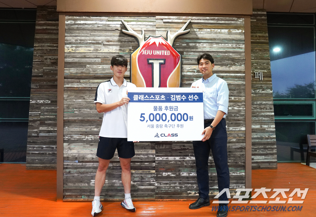[스포츠조선 이원만 기자] 프로 데뷔 3경기만에 현재 엄청난 활약으로 희망을 쏘아올린 제주 유나이티드의 김범수가 지난 13일 전 소속팀 K4리그 서울 중랑축구단에 의미있는 물품 기부를 했다. 김범수는 올 시즌 K리그가 발견한 '기적의 아이콘'이다. 대학 진학에 실패하여 현역으로 군복무를 마친 뒤에도 축구를 포기하지 않았다. 결국 7부리그(동호인리그)와 K리그4를 거쳐 제주 유나이티드 남기일 감독의 눈에 띄면서 K리그1에 입성했다. 마치 물 만난 고기처럼 곧바로 영입 첫 날 데뷔전을 치렀고, 데뷔 3경기 만에 프로 첫 골까지 터트리며 제주의 핵심 자원으로 거듭났다.