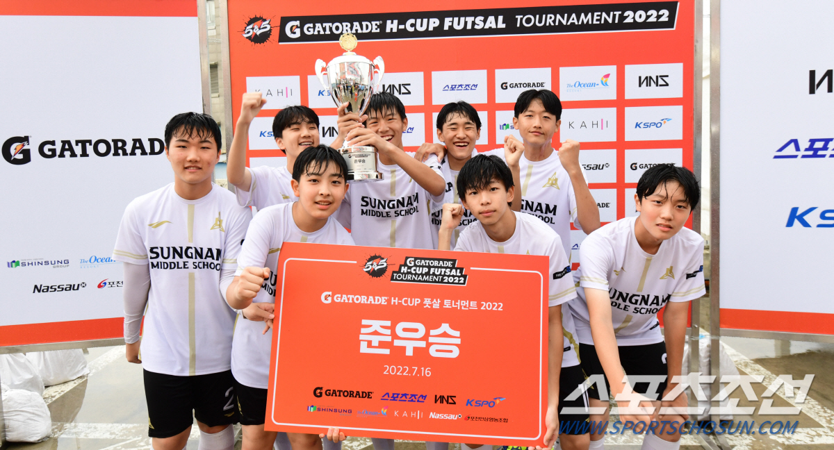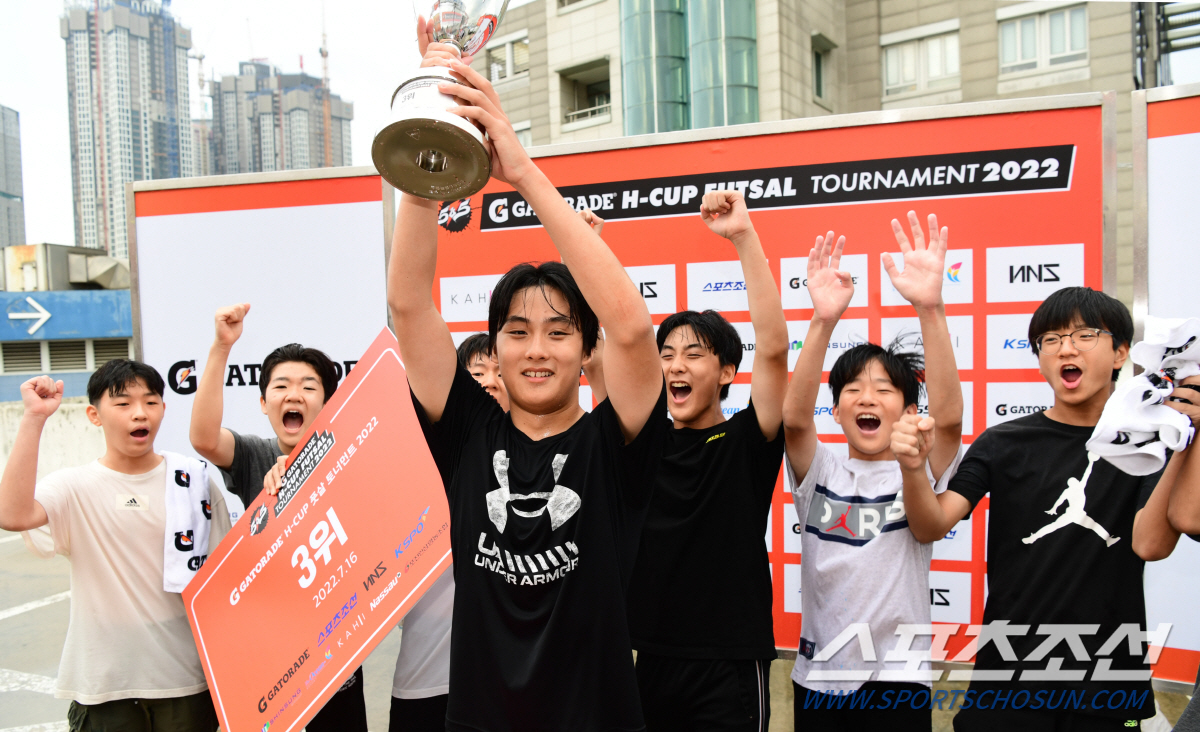 '5vs5 게토레이 H-CUP 풋살 토너먼트 2022' 서울예선전이 16일 HM풋살파크 동대문점에서 열렸다. 준우승을 차지한 성남중학교 선수들이 환호하고 있다. 동대문=최문영 기자 deer@sportschosun.com/2022.07.16/