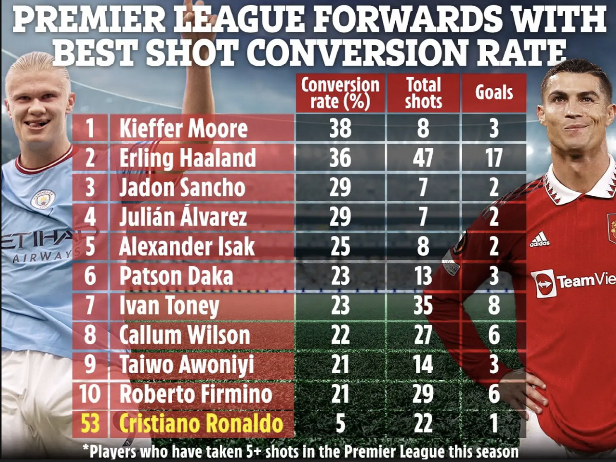 하지만 홀란드도 이 선수 앞에서는 고개를 숙인다. 본머스의 키퍼무어는 단 8번의 슈팅으로 3골을 만들어냈다. 전환율은 무려 38%에 달한다.
