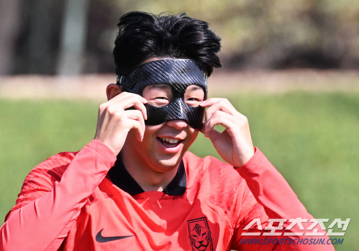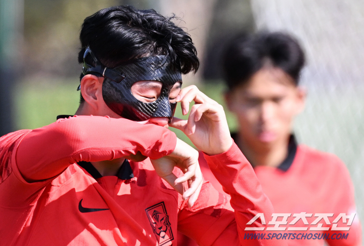[도하(카타르)=스포츠조선 송정헌 기자] 안와 골절 부상을 당한 손흥민이 처음으로 마스크를 착용하고 대표팀 훈련에 참가했다.