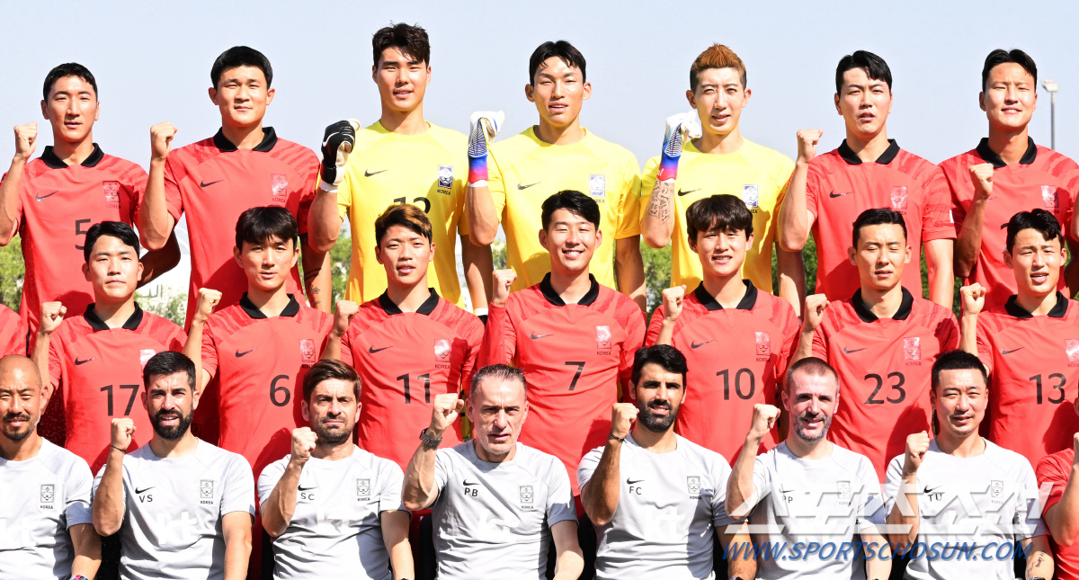 [도하(카타르)=스포츠조선 송정헌 기자] 손흥민의 합류로 완전체가 된 축구대표팀이 카타르월드컵 출전을 기념하는 단체 사진을 찍었다.