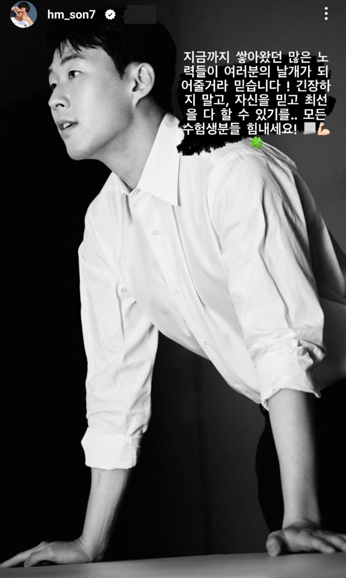 미래를 응시하는 듯한 자신의 사진 옆에 "지금까지 쌓아왔던 많은 노력들이 여러분의 날개가 되어줄 거라 믿습니다. 긴장하지 말고 자신을 믿고 최선을 다할 수 있기를…. 모든 수험생분들 힘내세요"라는 글과 함께 '행운의 네잎 클로버' 이모티콘을 붙였다.