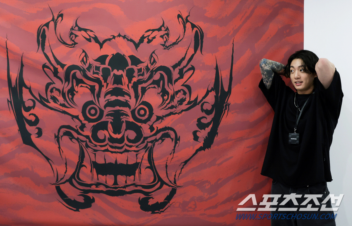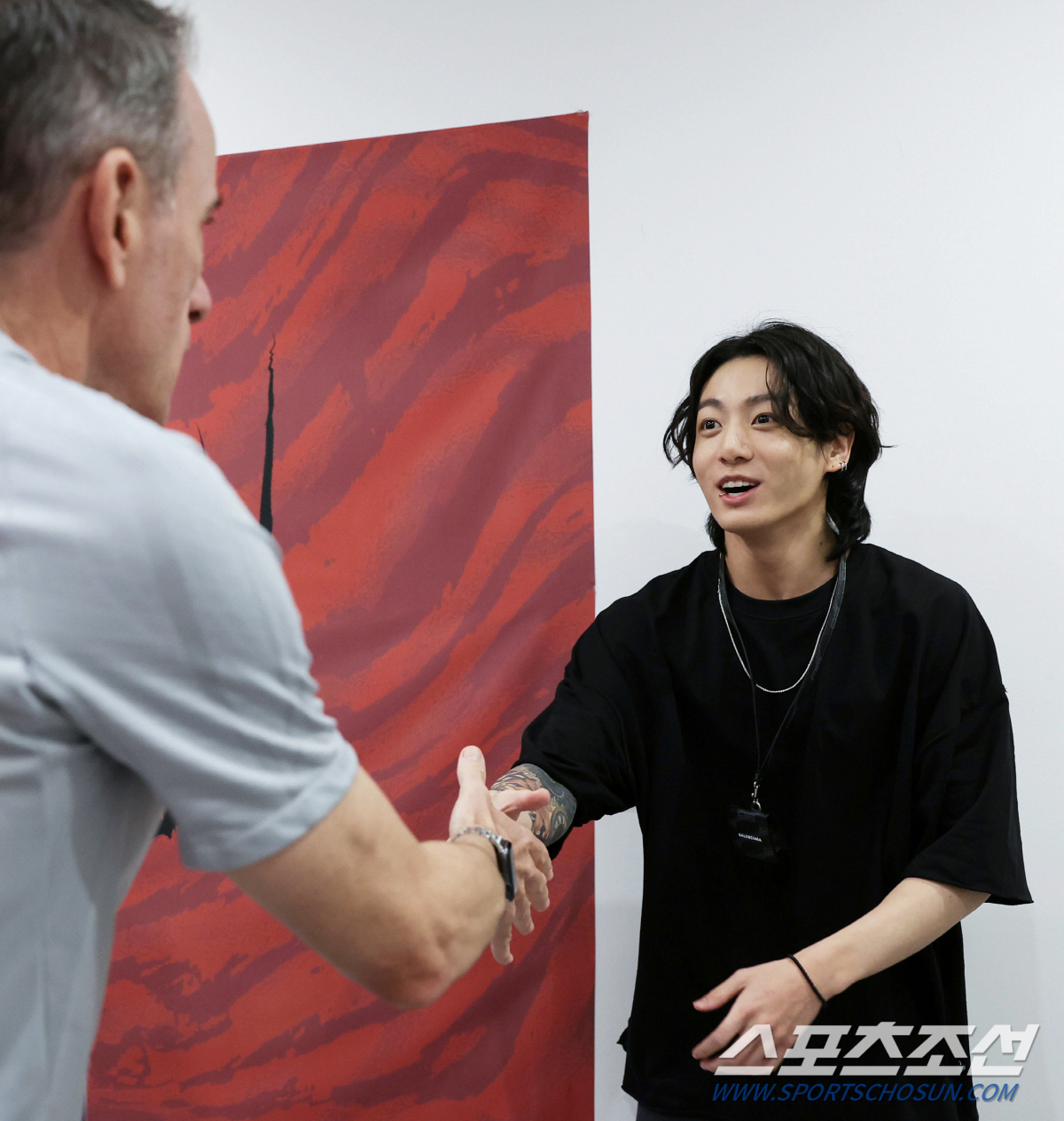 태극전사들과 반갑게 인사를 나눈 정국은 선수들과 함께 단체사진을 찍고 선수들에게 응원 메시지를 전달했다.
