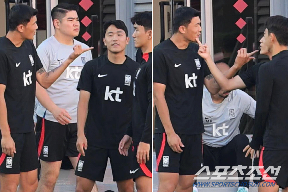본격적인 훈련을 앞두고 그라운드에 나선 김민재는 갑작스럽게 손가락을 내밀며 나성호에게 도발했다. 왼손과 오른손 검지를 번갈아 치켜들고 나상호를 향해 총을 쏘듯 포즈를 취했다. 나상호도 가만히 있지 않았다. 김민재를 향해 맞대응 삿대질을 했다.