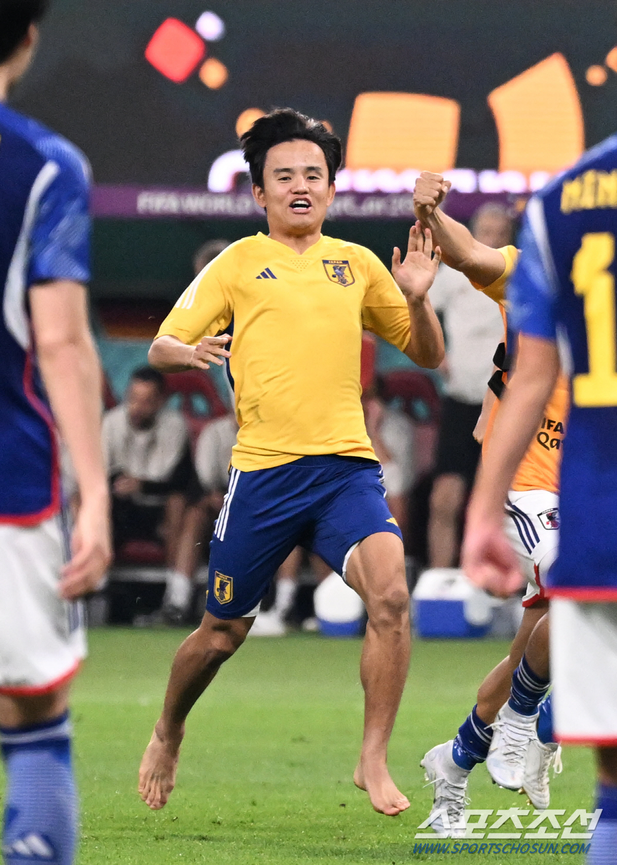 일본은 승리가 확정되자 모두가 뒤엉켜 역사적인 순간을 만끽했다. 구보의 '맨발 질주'도 화제다. 일찌감치 교체된 그는 벤치에서 '슬리퍼'를 신고 있었다. 구보는 종료 휘슬이 울리자 맨발로 그라운드를 뛰쳐나가며 포효했다.