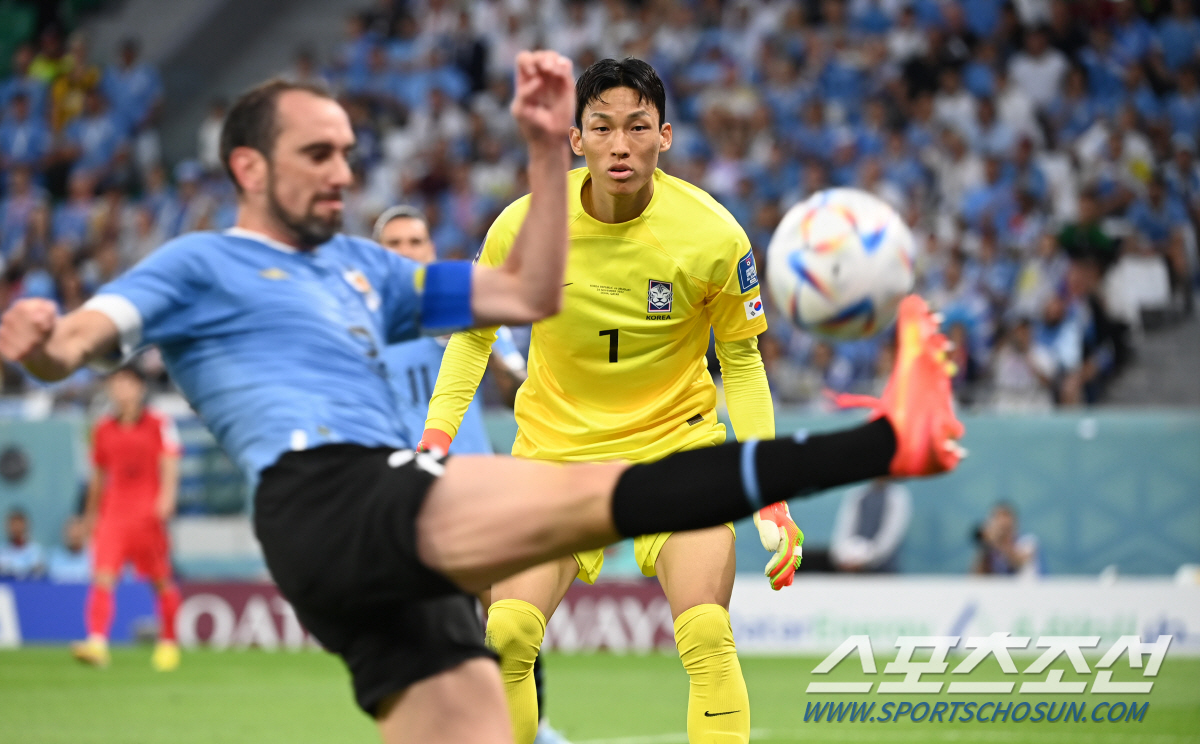 골키퍼 김승규가 24일 카타르 알라얀 에듀케이션 시티 스타디움에서 열린 2022 FIFA 카타르 월드컵 조별리그 H조 1차전 우루과이와 경기에서 고딘을 쳐다보고 있다. 알라이얀(카타르)=송정헌 기자songs@sportschosun.com/2022.11.24/
