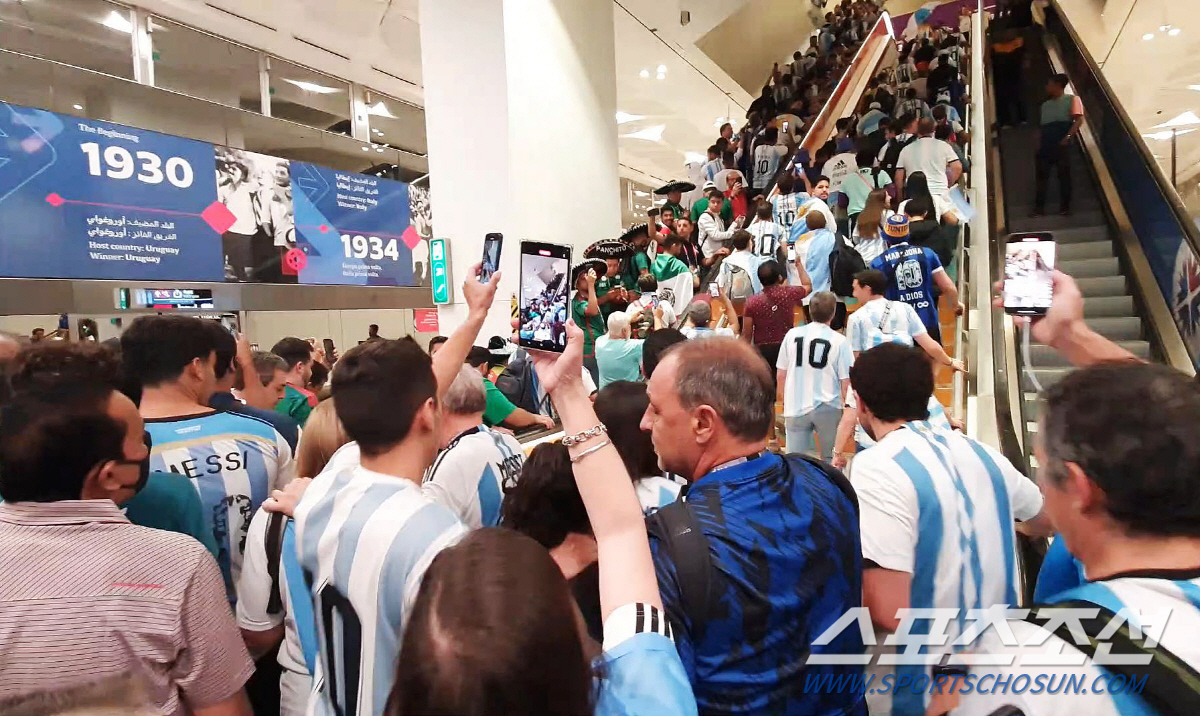 카타르 메트로(지하철)을 타고 루사일 역으로 이동하는 아르헨티나-멕시코 축구팬들은 자국의 응원가를 부르며 응원 대결을 펼쳤다.