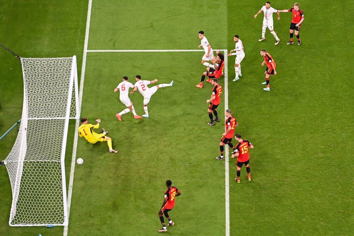 전반 18분 뫼니에의 슈팅이 골키퍼 손에 잡혔다. 전반 20분 하킴 지예흐가 강력한 왼발 중거리 슈팅으로 응수했다. 전반 27분 하키미의 헤더 백패스를 이어받은 셀림 아말라흐의 슈팅이 높이 떴다. 전반 28분 에버턴 소속 벨기에 미드필더 오나나가 공중볼 경합중 우나히를 팔꿈치로 가격하며 옐로카드를 받았다. 경고누적으로 크로아티아와의 최종전 출전이 불가능하게 됐다.