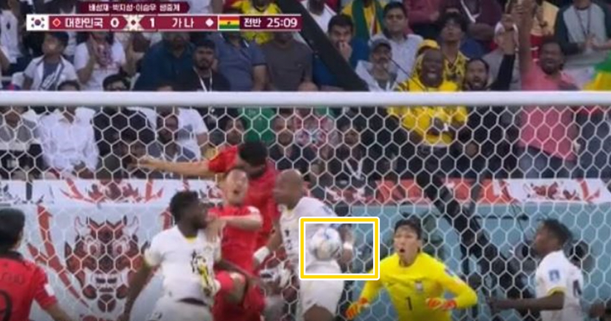 대한민국 축구대표팀은 28일 오후 10시(한국시각) 카타르 알라이얀 에듀케이션 시티 스타디움에서 열린 대한민국과 가나의 2022년 카타르월드컵 H조 조별리그 2차전에서 0-0 팽팽하던 전반 24분 선제 실점했다. 프리킥 상황에서 조던 아예우가 문전으로 띄운 공을 김민재가 헤더로 걷어냈지만 가나 안드레 아예우에게 맞은 공을 모하메드 살리수가 밀어넣었다. 한국선수들이 핸드볼을 주장했지만 앤서니 테일러 주심은 VAR를 가동한 후 골을 인정했다.