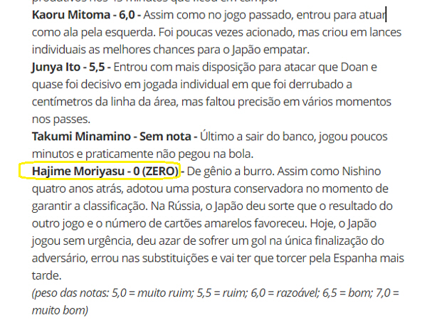모리야스 감독의 평점은 '제로'였다. '글로부'는 "천재에서 바보로. 4년 전 니시노 감독처럼 16강 확보를 위해 보수적인 입장을 취했다. 러시아에선 일본이 다른 경기의 결과와 옐로카드의 수로 인해 운좋게 16강에 올랐다"며 "오늘 일본은 긴박감 없이 경기를 치렀고, 상대의 유일한 슛으로 실점하는 불운을 겪었다. 모리야스 감독이 교체를 하는데 있어 실수가 있었다"고 코멘트했다. 일본은 러시아월드컵에서 1승1무1패 승점 4점을 기록했다. 최종전에서 폴란드에 패했지만, 같은 시각 콜롬비아가 세네갈을 잡아주면서 3위 세네갈을 페어플레이 점수로 따돌리고 16강에 올랐다.