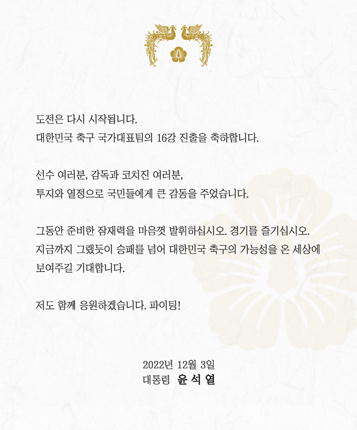 경기 뒤 윤 대통령은 SNS(소셜네트워크서비스) 축전을 통해 '도전은 다시 시작됩니다. 대한민국 축구 국가대표팀의 16강 진출을 축하합니다. 선수 여러분, 감독과 코치진 여러분, 투지와 열정으로 국민들에게 큰 감동을 주었습니다. 그동안 준비한 잠재력을 마음껏 발휘하십시오. 경기를 즐기십시오. 지금까지 그랬듯이 승패를 넘어 대한민국 축구의 가능성을 온 세상에 보여주길 기대합니다. 저도 함께 응원하겠습니다. 파이팅!'이라고 했다.